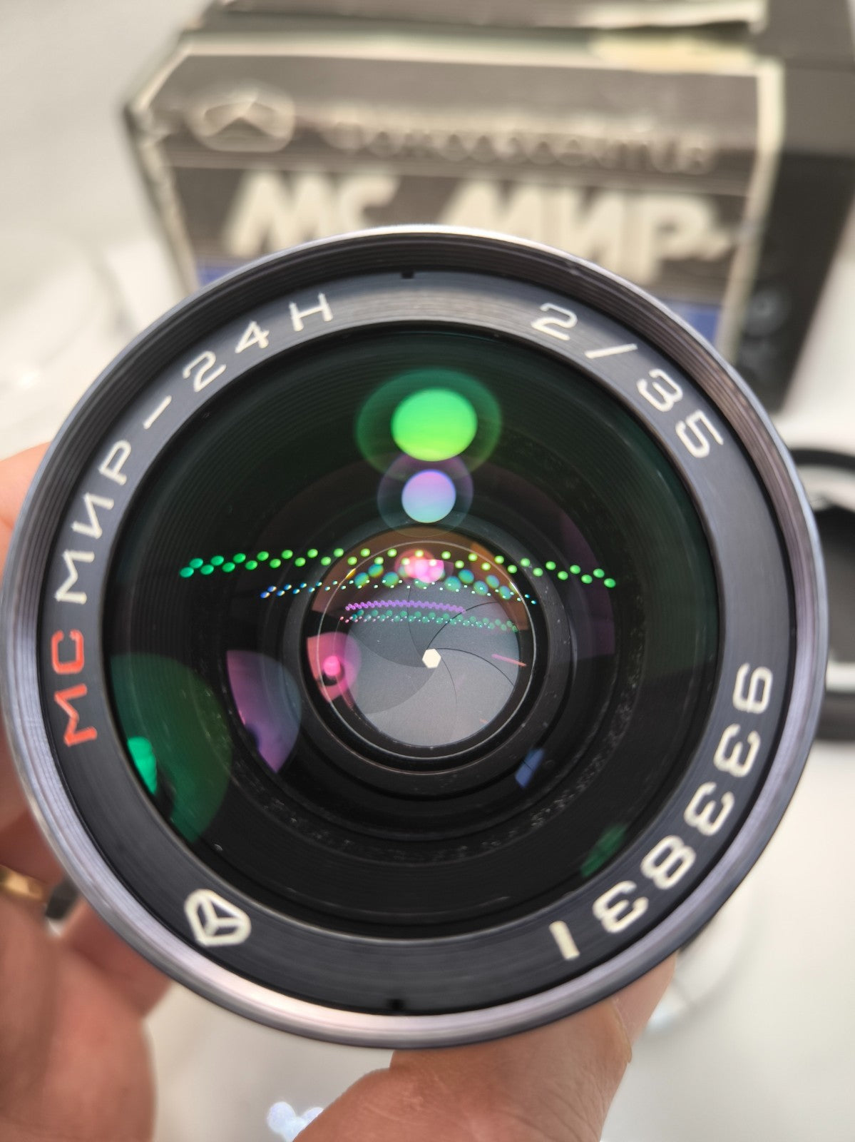 Other characteristics of Mir-24 35mm f/2: Resolution according to TU (center/edge): 40/21 lines/mm, Light transmission coefficient (MC Mir-24M): 0.90, Color formula (MC Mir-24M): 11--0--0, Working segment 45.5 mm, Attachments fitting Ø60 mm, Calculation: GOI, patent N288346, BI N36 1970.